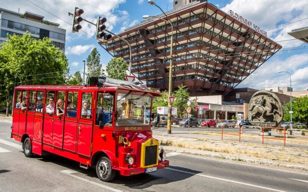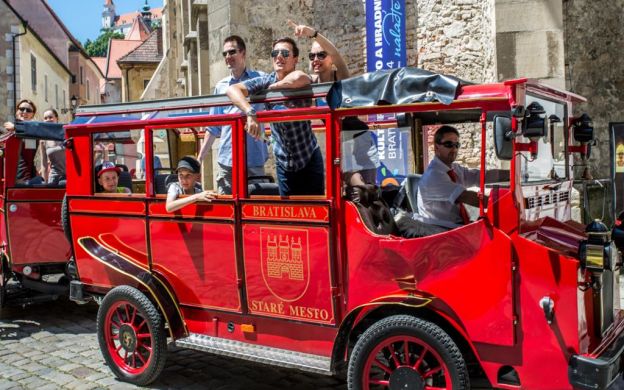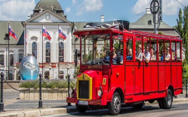 Um die schönsten Panoramablicke in Bratislava zu erleben, sind Sie bei unserer Panoramatour genau richtig. Um diese atemberaubenden Ausblicke zu genießen, können Sie mit dem Prešporácikom® Oldtimer fahren, der Sie bis hinauf zum Slavin bringt – einem historischen Denkmal aus dem 2. Weltkrieg. Während der 15-minütigen Pause können Sie den atemberaubenden Blick über Bratislava genießen, wo die Gebäude der Altstadt mit den modernen Glasgebäuden der Neustadt verschmelzen. Es ist ein Blick, den Sie nicht vergessen werden… Während Sie hier sind, können Sie auch die Natur des Parks erkunden und genießen sowie den gefallenen Soldaten gedenken.Anschließend bringt Sie der Prešporácikom® Oldtimer auf die andere Seite des Hügels, wo sich die Burg Bratislava befindet. Hier haben Sie während der 20-minütigen Pause die Möglichkeit, zu den Burgmauern zu gehen, von denen aus Sie den Horizont über die slowakisch-österreichische Grenze sehen und die letzten Hügel der Karpaten sehen, die ins Karpatenbecken hinabsteigen. Außerhalb der Burg können Sie den Barockgarten, den Burgbrunnen und den weitläufigen Innenhof besichtigen. Während der Tour zeigen wir Ihnen die majestätische Blaue Kirche, die aussieht, als käme sie direkt aus einem Märchen, das moderne Gebäude des Slowakischen Nationaltheaters, das neue Einkaufszentrum Eurovea, das Sie sich nicht entgehen lassen sollten. Seine Fassade besteht aus Glas. Wir machen Sie mit unserer Geschichte vertraut, von der Gründung des Königreichs Ungarn über die Herrschaft Maria Theresias, die Zeit des Sozialismus bis hin zur Gegenwart. Sie werden auch das historische Gebäude des Slowakischen Nationaltheaters und den Ganymed-Brunnen, das Regierungsgebäude, den Präsidentenpalast und viele weitere interessante Gebäude sehen.