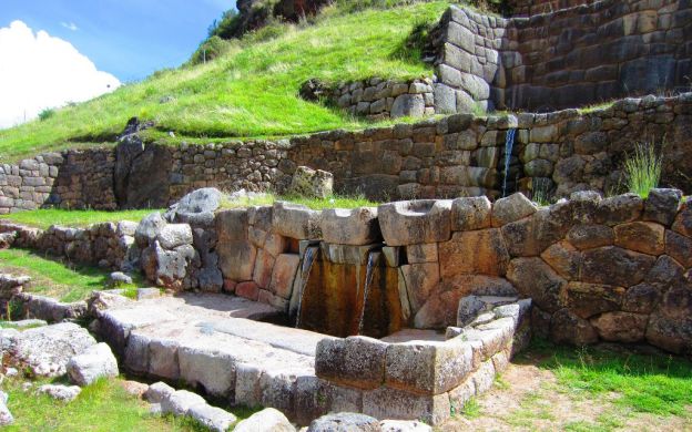 Als Nächstes erkunden Sie die Brunnen von Tambomachay , ein Bauwerk mit feinen Steinverzierungen und einer hohen Beherrschung der Wasserbaukunst, mit Aquädukten, die diesen Ort weiterhin mit klarem Wasser versorgen. Dieser archäologische Komplex liegt acht Kilometer von der Stadt Cusco entfernt. Tambomachay, auch bekannt als das „Inka-Bad“, war wahrscheinlich der Erholungsort für den Inka und sein Gefolge. Das Bauwerk scheint ein besonderes Interesse an Wasser zu haben, das es verehrte, und feine Aquädukte speisten sich aus Grundwasserleitern und benachbarten heißen Quellen.