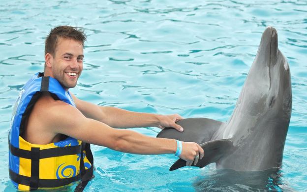 Danach schwimmst du zur Mitte des Wassers, wo der Delfin an dir vorbeischwimmt, damit du seine Rückenflosse sehen kannst. Du wirst seine Rufe hören, und zum Schluss wird er dich mit einem Wasserschwall bespritzen.